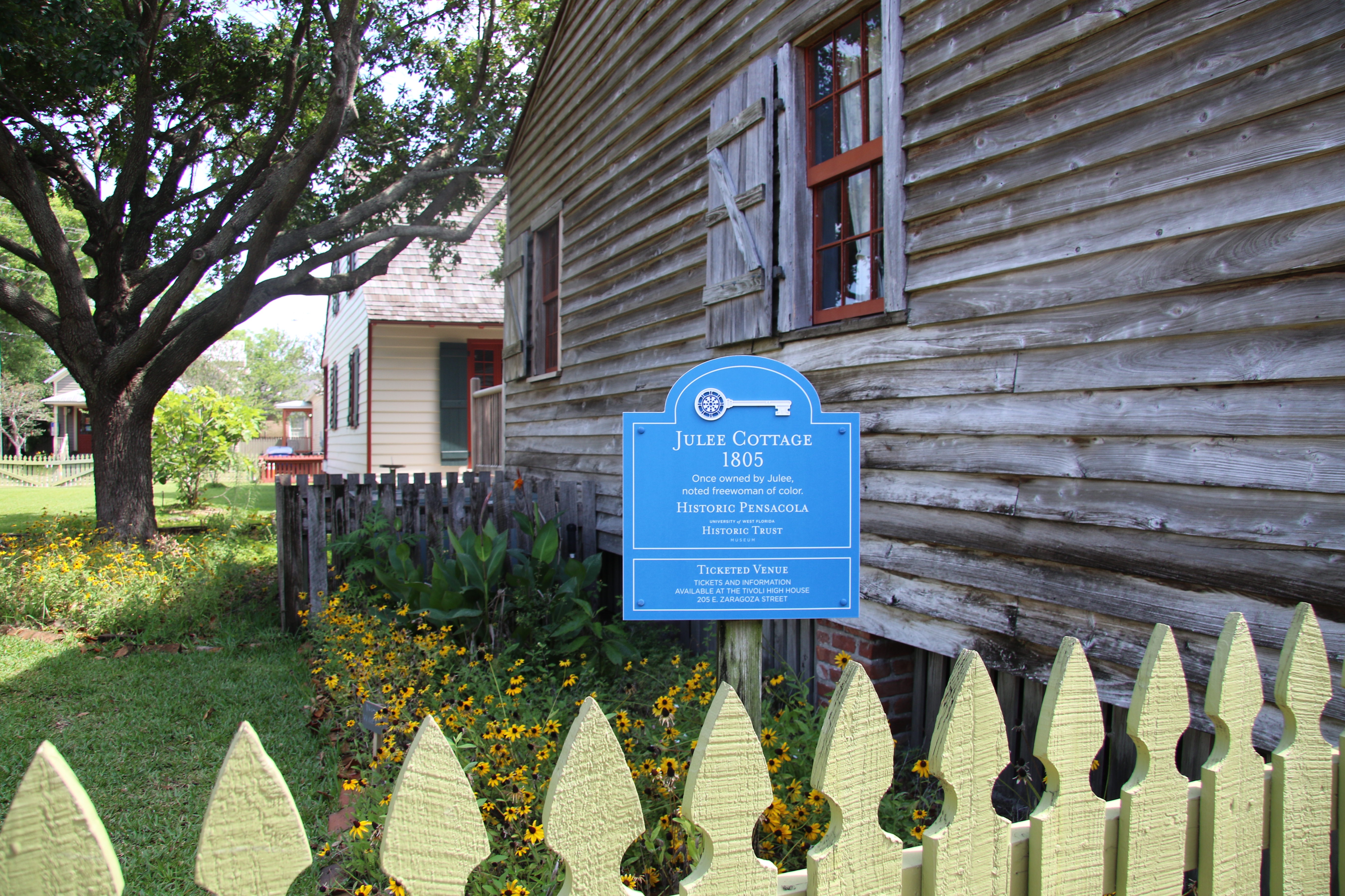Built around 1805, the Julee Cottage was named for one of its earliest owners, Julee Panton, a free woman of color. The cottage is an early example of platform frame construction, reminiscent of the Creole cottages of the New Orleans French Quarter. It presently displays a “saltbox” shape, built to the sidewalk with no front porch, but cut off roof joists at the south wall suggest the building once had an overhang. It is the only surviving form of this urban Creole architecture in Pensacola. The cottage, included in the self-guided tour, represents the cottage of a working class African-American family during the era of Reconstruction.